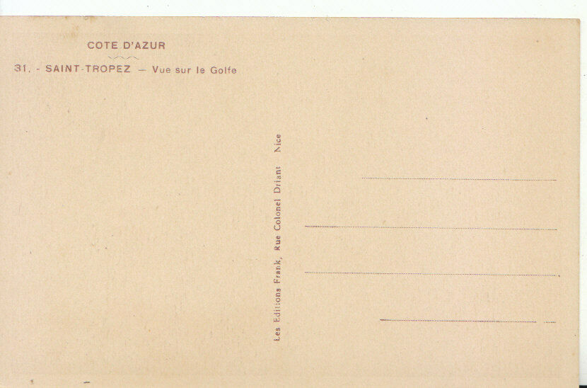 Mo's Postcards Postcard Description: France Postcard - Saint Tropez - Vue sur le GolfeGenealogy Information: Defects: Very feint crease to top right hand corner Postage & Payment: For U.K residents the quoted P & P fee is for any number of postcards purchased at one time. Happy to quote for non UK residents. For multiple purchases please wait for an invoice