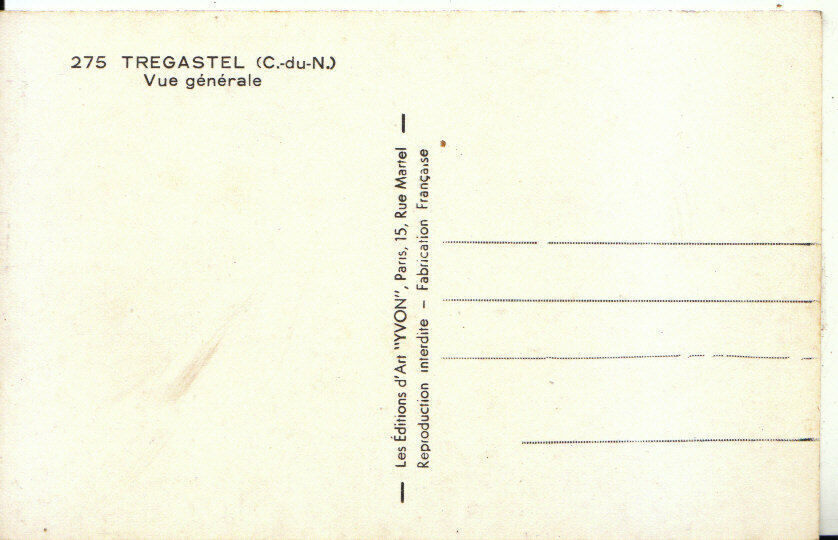 Mo's Postcards Postcard Description: France Postcard - Tregastel - Vue Generale Genealogy Information: Defects: A few very tiny marks to card Postage & Payment: For U.K residents the quoted P & P fee is for any number of postcards purchased at one time. Happy to quote for non UK residents. For multiple purchases please wait for an invoice Listing and template services provided by inkFrog