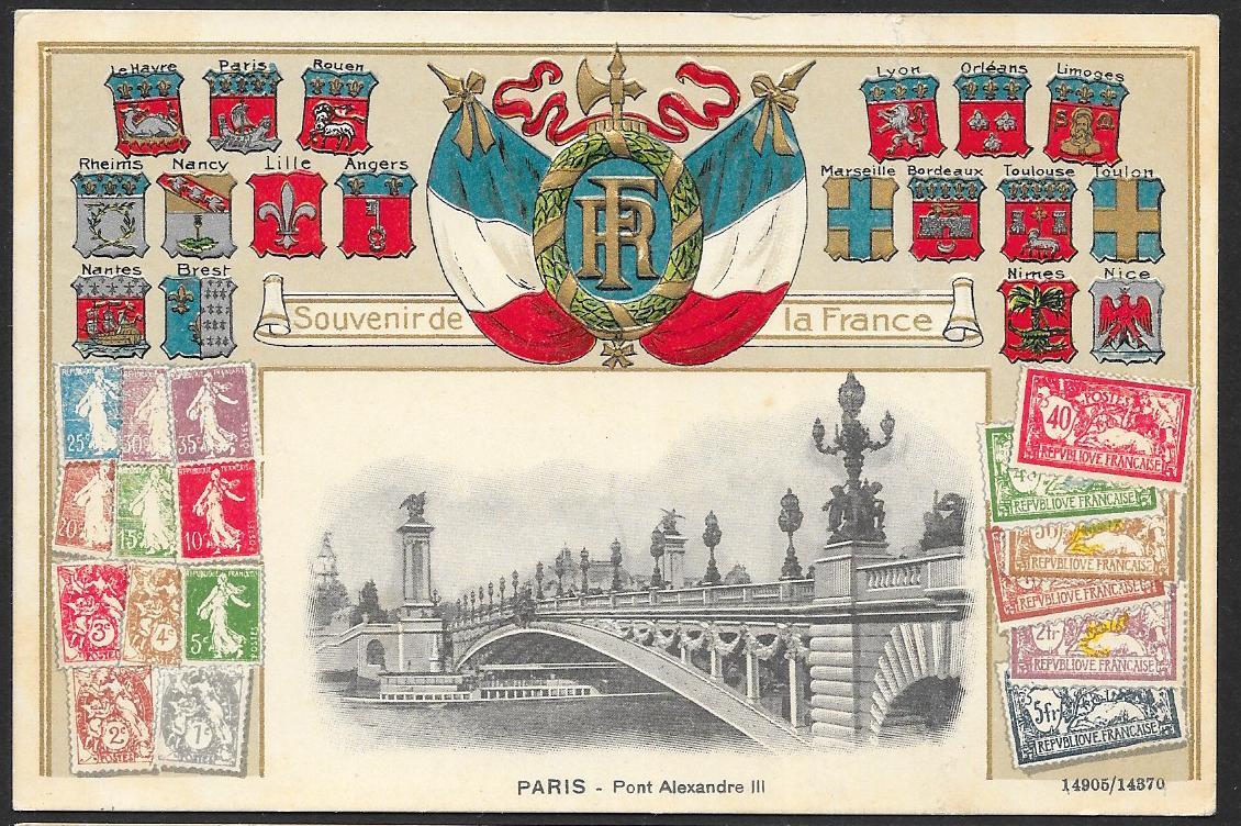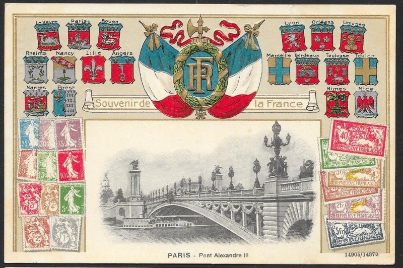 FRANCE Stamps on Postcard Embossed Shield Used c1910s
