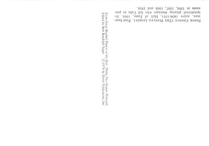 Frank Chance (The Peerless Leader) First Baseman Modern Card Baseball Postcard Postal Date: {{Product Field 4 ( Postal Used, Unused)}} Grade: 1 Size: Continental Size - approximately 4 inch x 6 inch or 10 CM x ... Read More