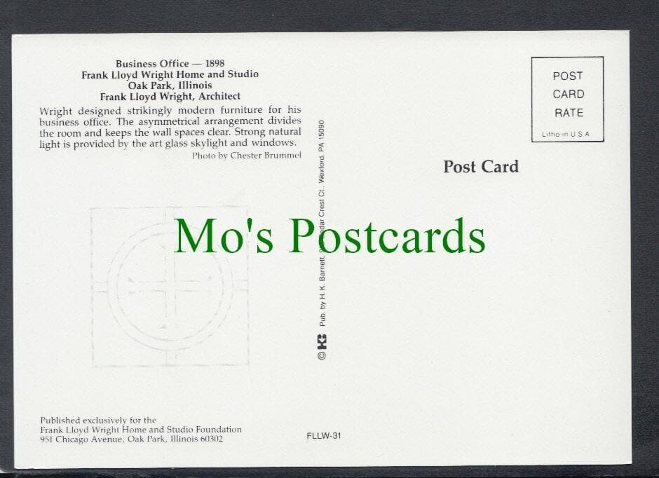 Postcard showing a postcard of Frank Lloyd Wright Home, Oak Park, Illinois Mo's Postcards offers for sale a postcard of Frank Lloyd Wright Home, Oak Park, Illinois. Business Office - 1898. Continental size postcard. ... Read More