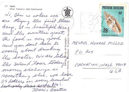 Nice card showing Tahara's Hotel which spills down a lush hillside above Matavai Bay in Tahiti. Beautiful card sent from Tahiti to Carnation, Washington in 1979. Great cancellation - great French Polynesia stamp.Seller Information