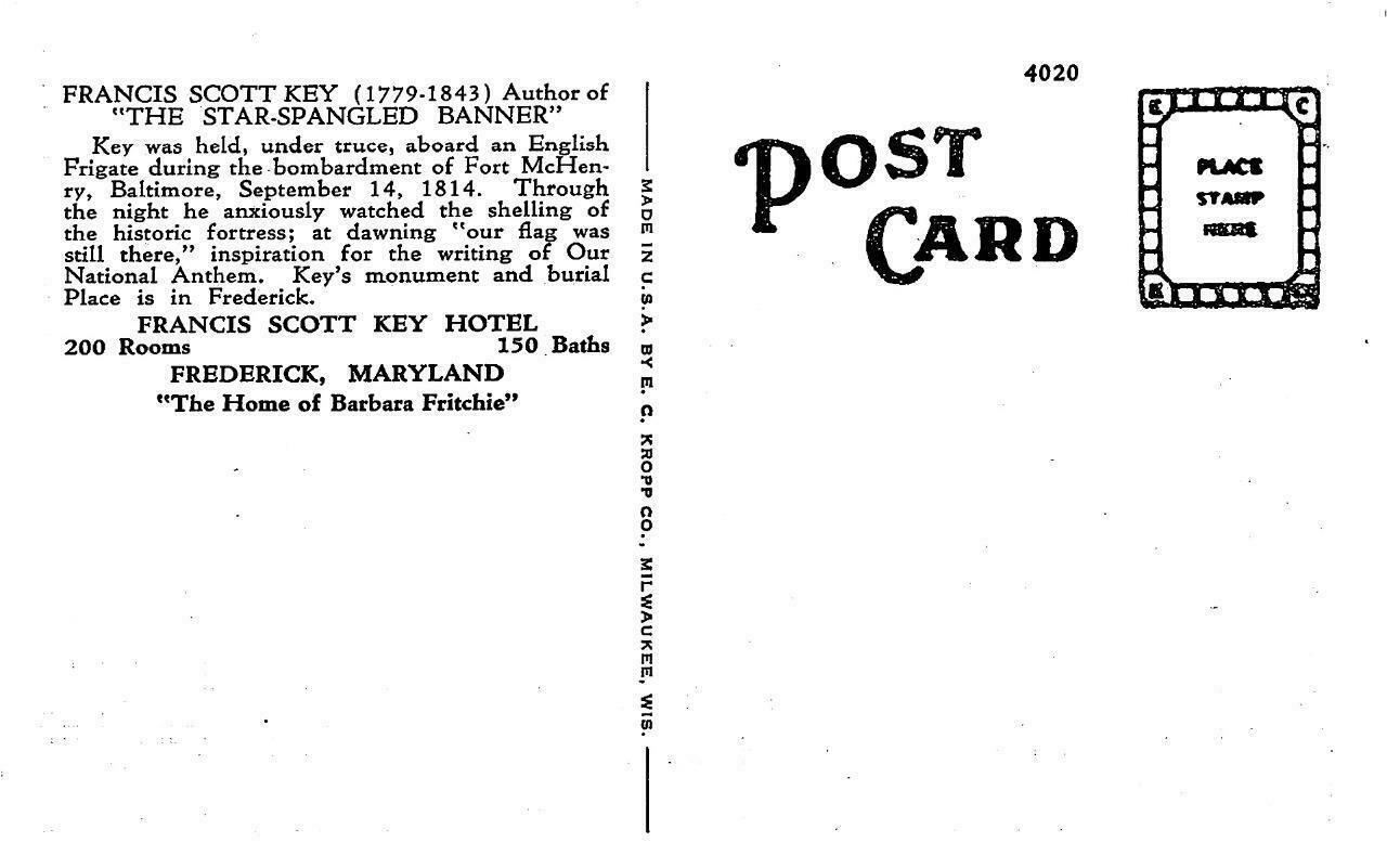 Frederick, md maryland francis scott key hotel & grave~monument c1940s postcard