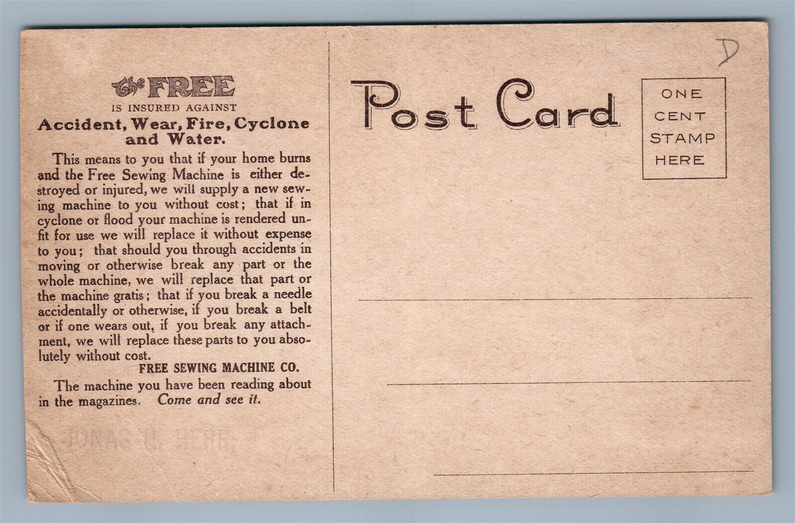 FREE SEWING MACHINE CO ADVERTISING ANTIQUE POSTCARD