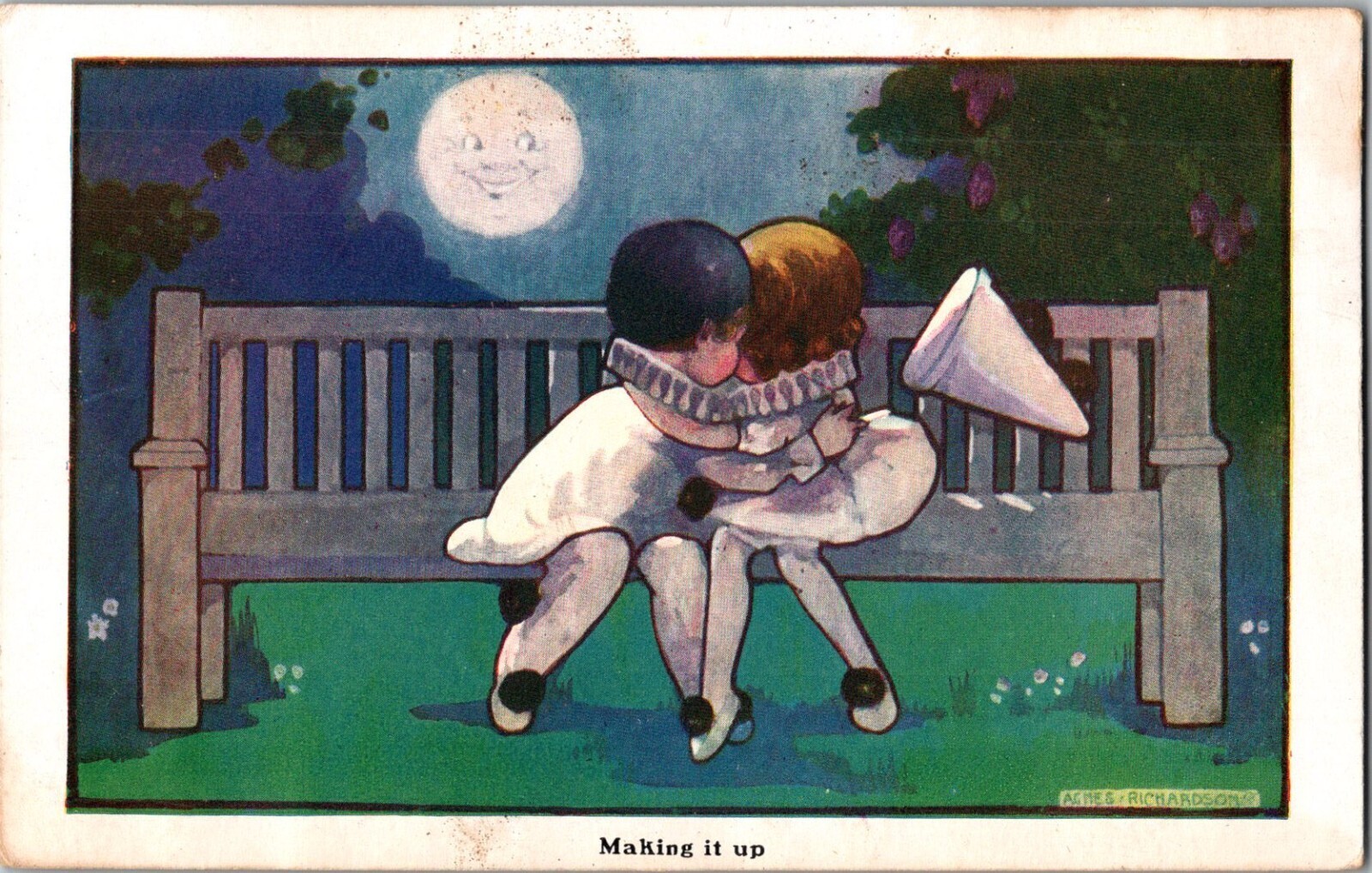 French Clowns Kissing AGNES RICHARDSON Vintage Postcard making it up JY8