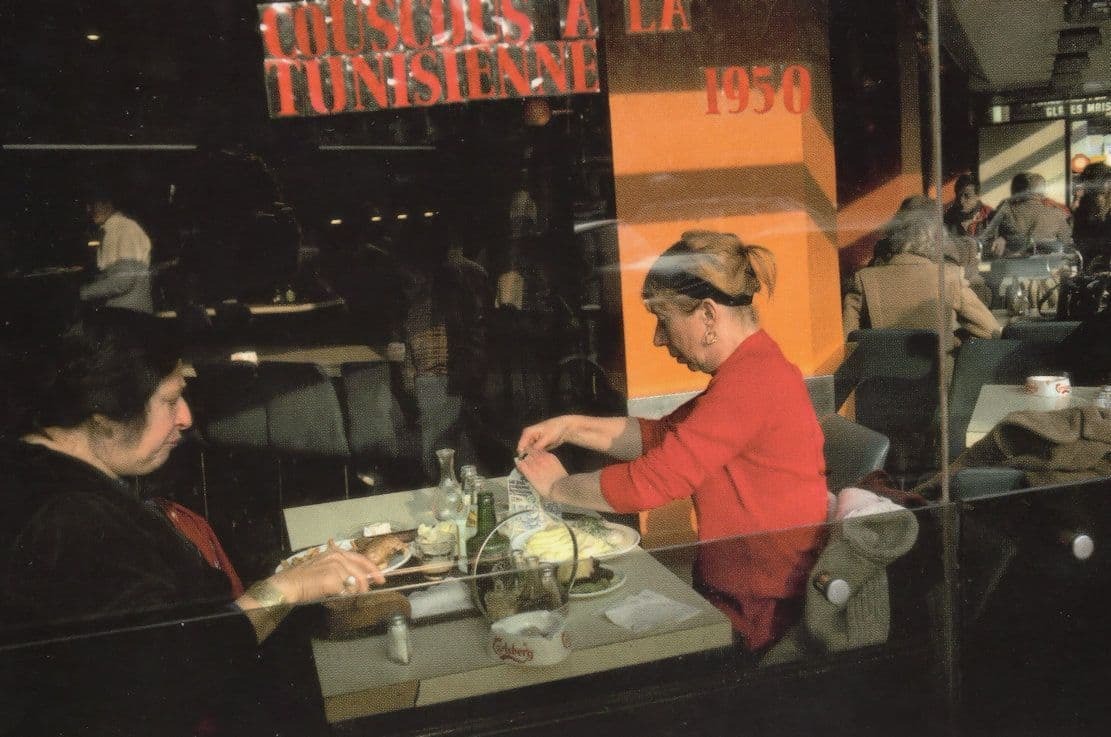 MG* This undated but modern origin real photo postcard and I believe an award winner when published in the 1950s shows a unique French restaurant of the day with diners enjoying their food but what makes this work so special is its incredible use of vibrant colours surrounding the diners - the lady wears flourescent red - the signs for the food are the same colour red - orange shadows are below - the shadow fly round the room in diagonals - this photographic artist was one of the most famous French photographers for how he managed to manipulate colours in the era and its date etc of this rare work on reverse unused and pristine condition