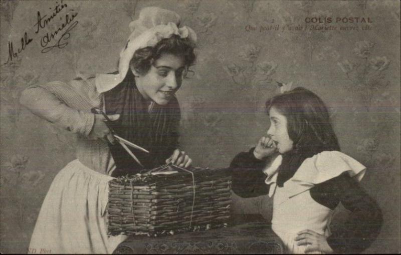 French Girls Open Package w/ Old Scissors Colis Postal c1900 Postcard