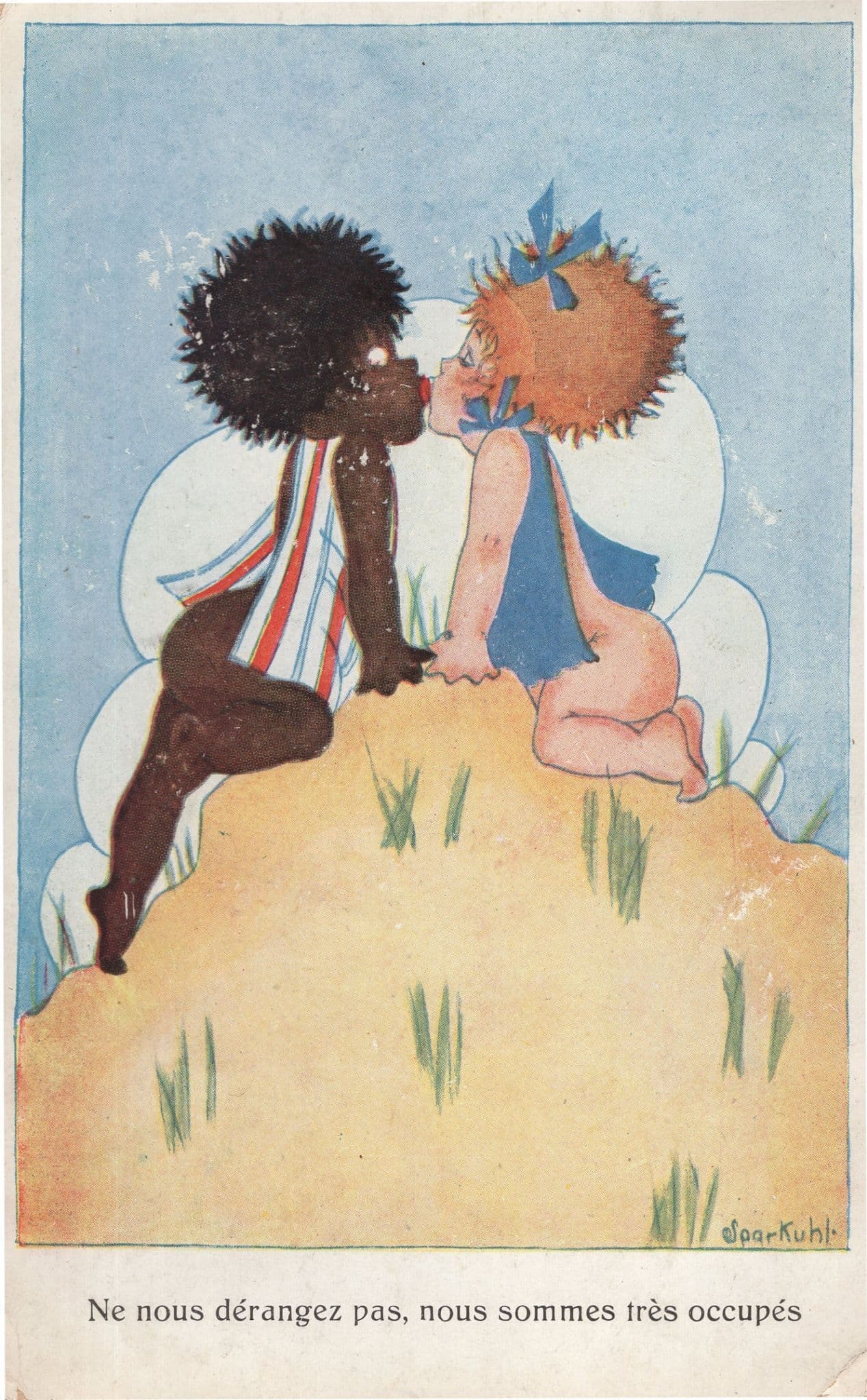 French Racial Harmony Ethnic Mixed Race Kissing Comic Old Postcard