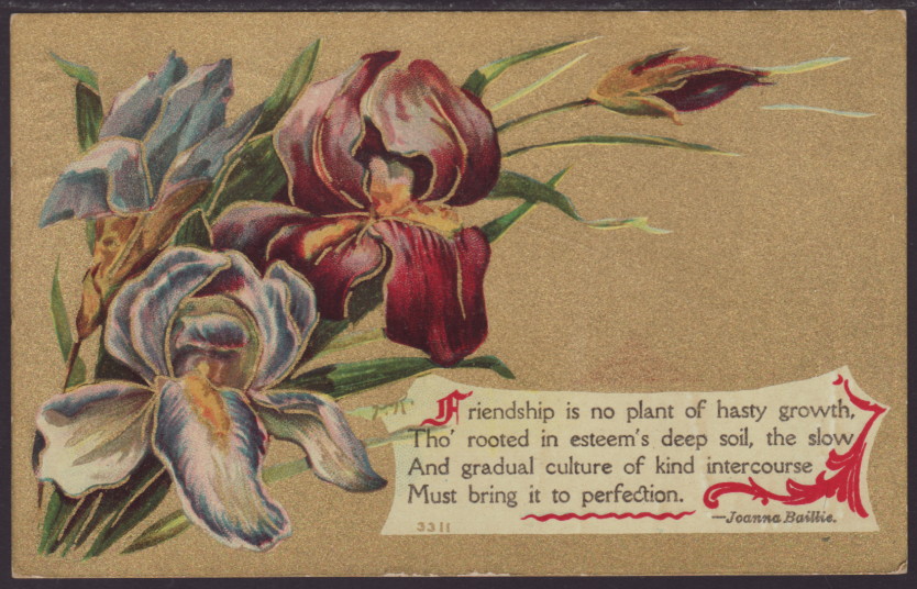 Friendship,Irises Postcard Postally used Litho divided back. Ex  Grading Terms MINT - Perfect in every way, regardless of age. Rarely seen, may not exist. NM - Near Mint, you have to look closely to see t ... Read More