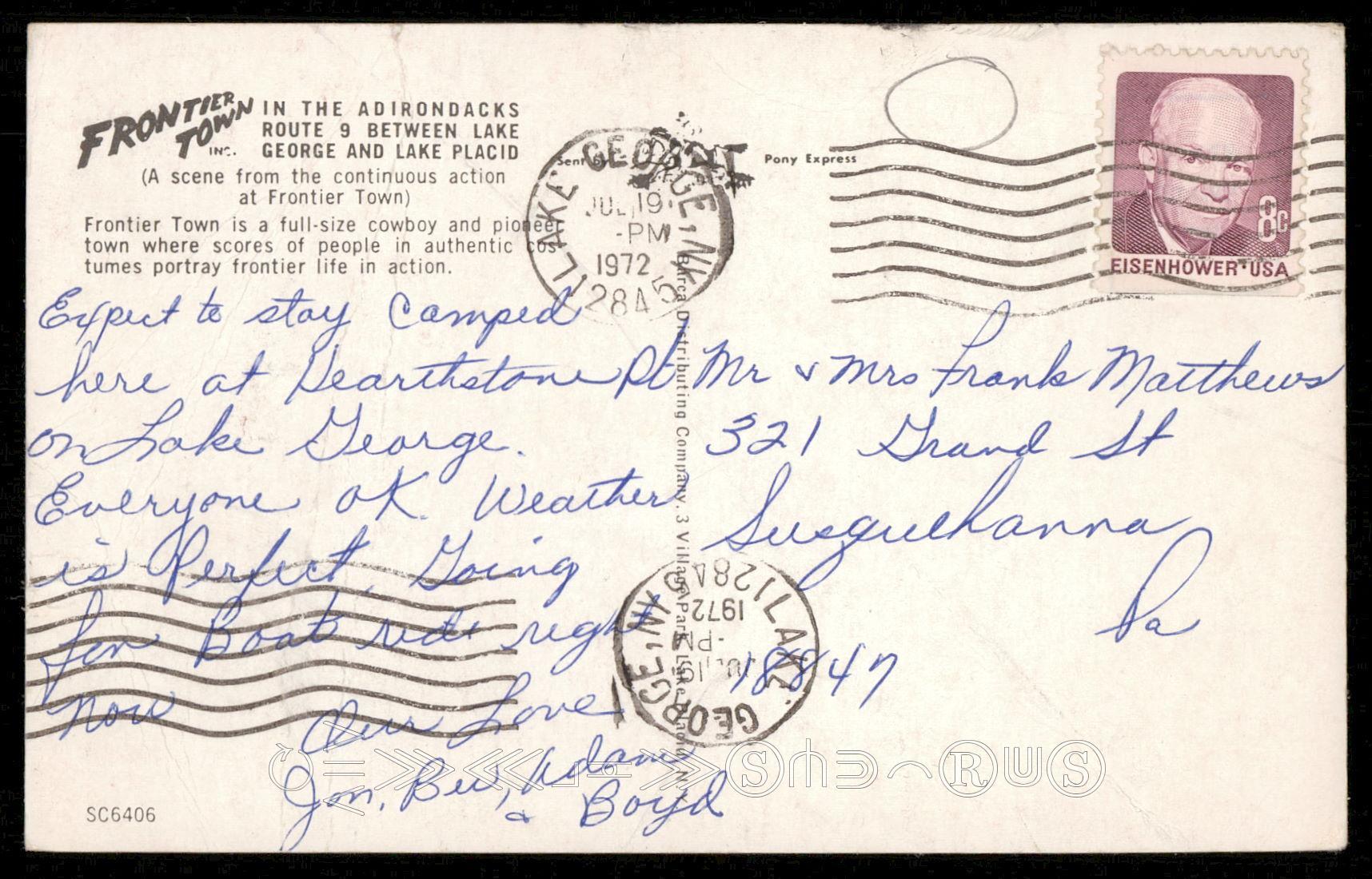 Title: FRONTIER TOWN IN THE ADIRONDACKS Condition: See scans Year: 1972 Postmark: Lake George, NY Jul 19 1972 Publisher: Barca Distributing Company Keywords: Route 9 Between Lake George and Lake Placid Relat ... Read More
