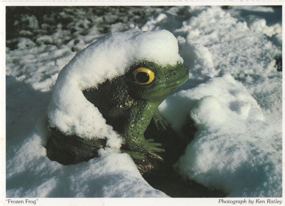 bg694 A rare 1980s postcard from an Essex photographer of this frozen frog that in view the photographer was a member of the photographic society where published it would seem an award photo of its decade unused and mint.