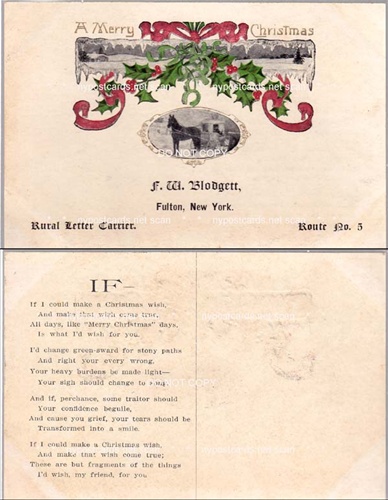 F.W.Bolodgett, Letter Carrier, Fulton Ny Description: Postal Usage: Unmailed Condition: Near Mint Type: Printed Note: County: Oswego Co. > Fulton