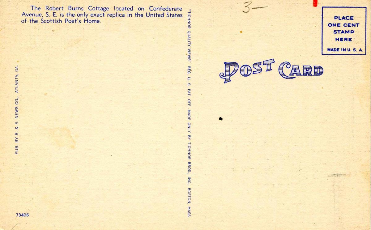 GA - Atlanta. Robert Burns Cottage --- * Grading of Postcards MINT (M): Perfect condition, no apparent blemishes, flaws, postally unused, may have some writing on back. NEAR MINT (NM): Like new, image is uncomprom ... Read More