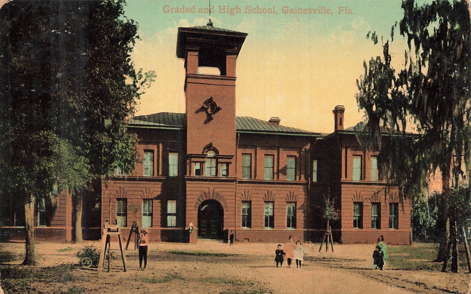 Step back in time with this compelling vintage postcard featuring the Graded and High School in Gainesville, Florida, as it appeared in the early 20th century. This historic image showcases the impressive brick architecture of the school building, complete with its distinctive central bell tower, reflecting the educational pride of the era. The scene captures a moment in time with figures on the unpaved grounds and mature trees framing the structure, offering a glimpse into daily life and the urban landscape of Gainesville over a century ago. The card is a fine example of early chromolithography, with vibrant, hand-colored tones that bring the historical scene to life.This postcard is a genuine piece of Florida history, postmarked January 24, 1908, from Gainesville, Florida. It bears a one-cent Benjamin Franklin stamp and was sent to Jacksonville, Florida. Produced by The American News Company's Publishing Co. Ltd. of New York and printed in Germany, it represents a common practice of the period for high-quality postcard production. Collectors of Florida memorabilia, educational history, or early 20th-century postcards will appreciate the intricate details and historical significance of this charming piece. It's a vivid reminder of Gainesville's past and the evolution of its architectural and educational heritage.
