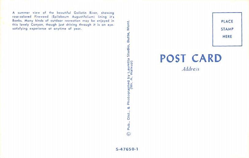 Gallatin River - Butte, Montana Grade: 1 Category: Continental Size Postcard, Approx 4 in x 6 in (10 cm x 15.25 cm) Product Size: Regular (or Standard) size: 3 1/2 X 5 1/2 (9 cm X 14 cm) Grading Scale: Grade 1 ... Read More