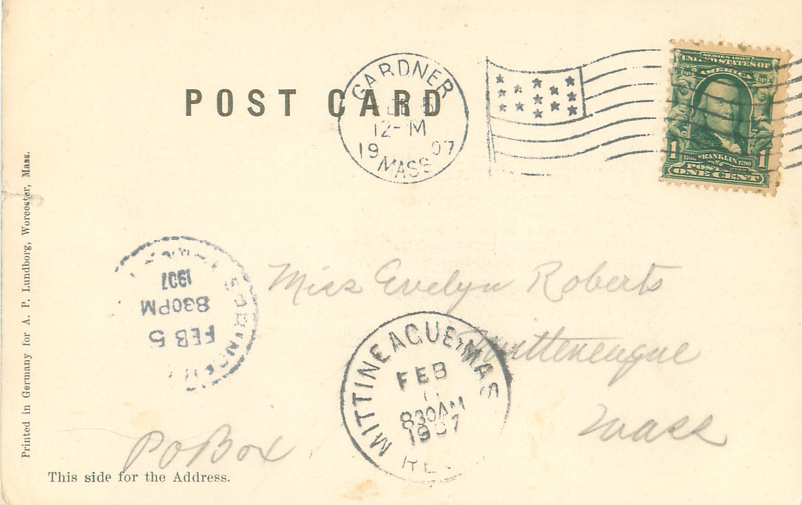 Gardner Massachusetts Crystal Lake 1907 Postmark Flag Cancel
