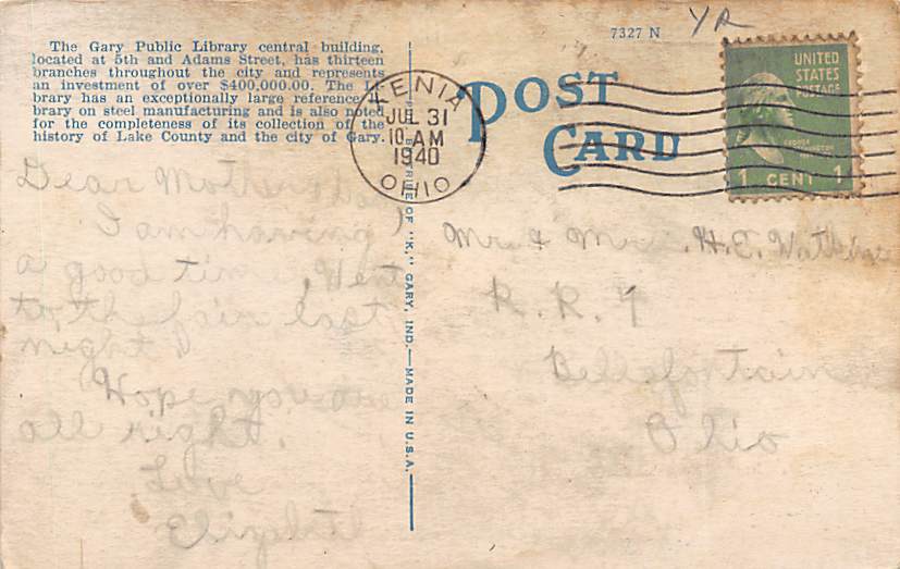 Gary Public Library Gary IN USA Postcard, Grade: 3 - a lot of yellowing from age Size: Regular Size Postcard - approximately 3 1/2 inch x 5 1/2 inch (9 CM x 14 CM) Grading Scale: Grade 1 = Perfect corners Grade ... Read More
