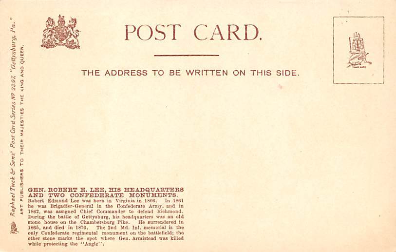 Gen. Robert E. Lee, headquarters, Confederate Monuments Gettysburg, Pennsylvania PA Postcard