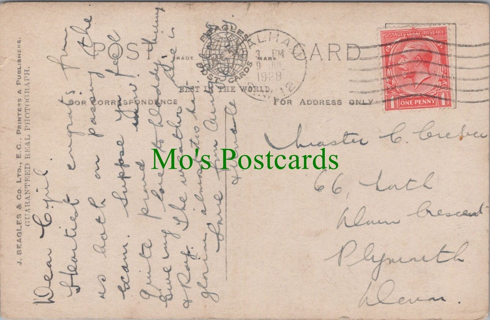 Mo's Genealogy Postcards Recipients Name: Master Cyril Cuber? Recipients Address: 66 ??th, ???? Crescent, Plymouth, Devon Sender Details: Please ignore any lines caused by the scanner. Genealogy: In an effort to assist people researching their family history I have decided to make postally used pre 1960 postcards available for research purposes. These postcards will have defects which range from minor creases and tears to major faults. The postcards are only being offered for research purposes. Please do not expect a damage free postcard. I will endeavour to list the recipients correct details. Errors may be made. To improve your chances of locating an ancestor why not type the name or address into the search box of my store. Imagine obtaining a postcard written or received by an ancestor. These unique historical records are priceless. Listing and template services provided by inkFrog