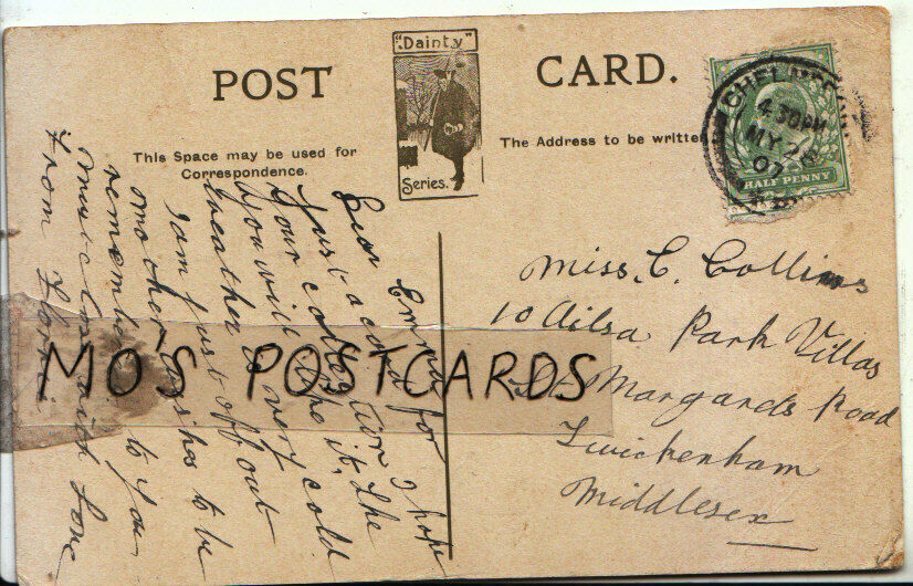 Mo's Genealogy Postcards Recipients Name: Miss Emma Collins Recipients Address: 10 Ailsa Park Villas - St Margaret's Road - Twickenham - Middlesex Sender Details: Florrie Genealogy: In an effort to assist people researching their family history I have decided to make postally used pre 1960 postcards available for research purposes. These postcards will have defects which range from minor creases and tears to major faults. The postcards are only being offered for research purposes. Please do not expect a damage free postcard. I will endeavour to list the recipients correct details. Errors may be made. To improve your chances of locating an ancestor why not type the name or address into the search box of my store. Imagine obtaining a postcard written or received by an ancestor. These unique historical records are priceless.