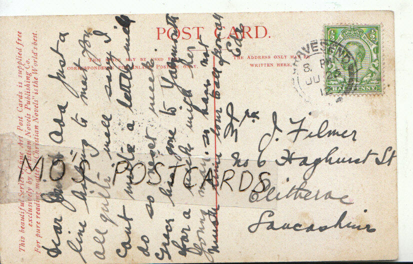 Mo's Genealogy Postcards Recipients Name: Mrs J. Filmer - Ada Recipients Address: No.6 Hayhurst Street - Clitheroe - Lancashire Sender Details: Ede Genealogy: In an effort to assist people researching their family history I have decided to make postally used pre 1960 postcards available for research purposes. These postcards will have defects which range from minor creases and tears to major faults. The postcards are only being offered for research purposes. Please do not expect a damage free postcard. I will endeavour to list the recipients correct details. Errors may be made. To improve your chances of locating an ancestor why not type the name or address into the search box of my store. Imagine obtaining a postcard written or received by an ancestor. These unique historical records are priceless.