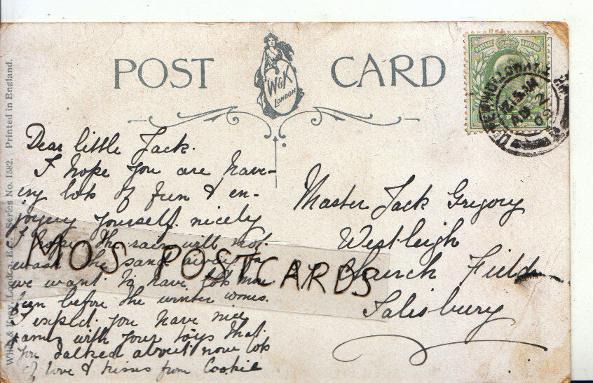 Genealogy: in an effort to assist people researching their family history i have decided to make postally used pre 1960 postcards available for research purposes. These postcards will have defects which range from minor creases and tears to major faults. The postcards are only being offered for research purposes. Please do not expect a damage free postcard. I will endeavour to list the recipients correct details. Errors may be made. To improve your chances of locating an ancestor why not type the name or address into the search box of my store.