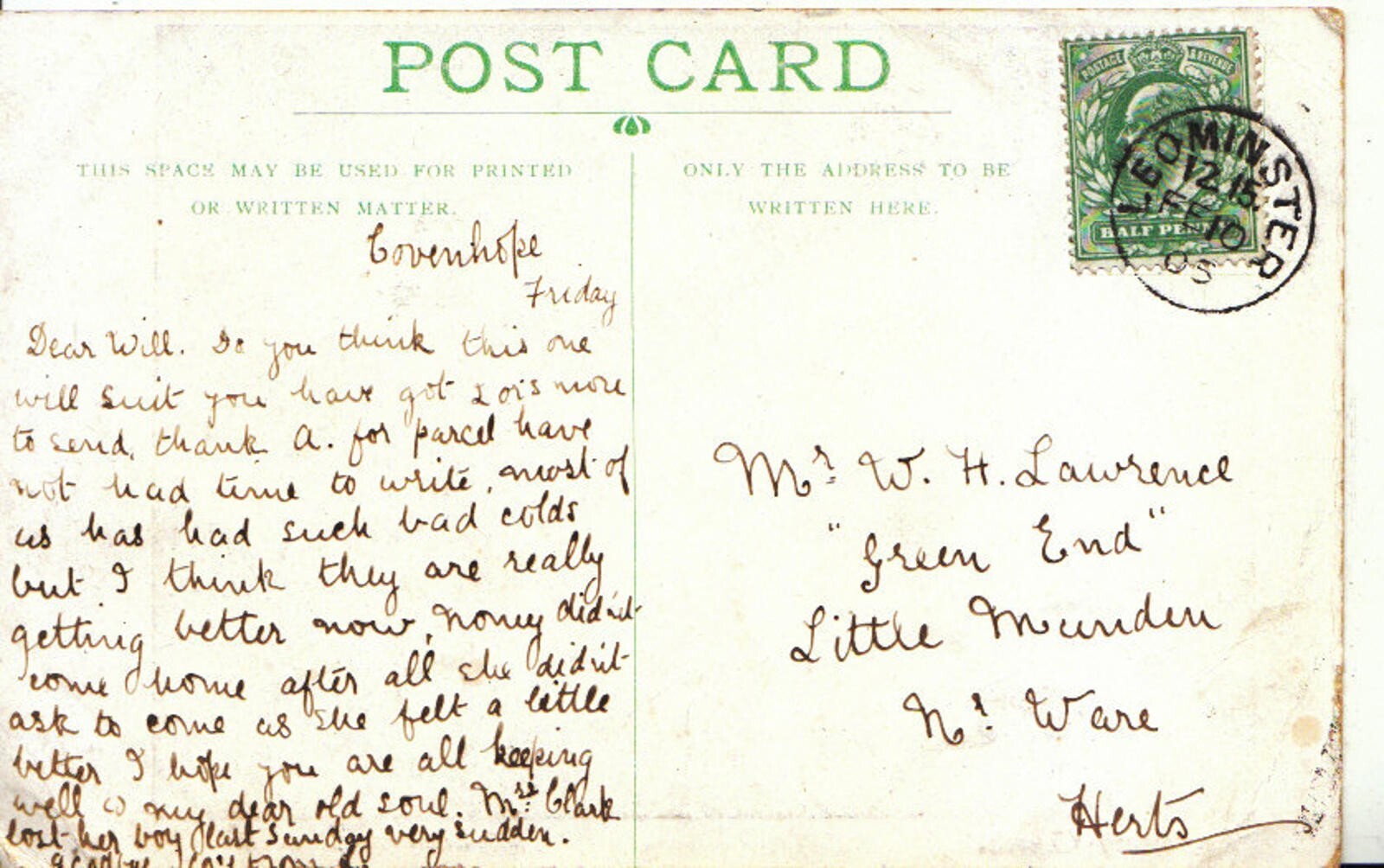 Mo's Genealogy PostcardsRecipients Name: Mr Will H LawrenceRecipients Address: "Green End", Little Munden, Near Ware, HertsSender Details: L - CovenhopeGenealogy: In an effort to assist people researching their family history I have decided to make postally used pre 1960 postcards available for research purposes. These postcards will have defects which range from minor creases and tears to major faults. The postcards are only being offered for research purposes. Please do not expect a damage free postcard. I will endeavour to list the recipients correct details. Errors may be made. To improve your chances of locating an ancestor why not type the name or address into the search box of my store.Imagine obtaining a postcard written or received by an ancestor. These unique historical records are priceless.