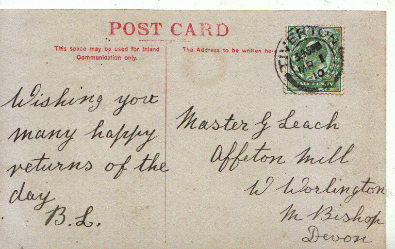 Mo's Genealogy Postcards Recipients Name: Master G Leach Recipients Address: Affeton Mill, West Worlington, M Bishop, Devon Sender Details: B.L. Genealogy: In an effort to assist people researching their family history I have decided to make postally used pre 1960 postcards available for research purposes. These postcards will have defects which range from minor creases and tears to major faults. The postcards are only being offered for research purposes. Please do not expect a damage free postcard. I will endeavour to list the recipients correct details. Errors may be made. To improve your chances of locating an ancestor why not type the name or address into the search box of my store. Imagine obtaining a postcard written or received by an ancestor. These unique historical records are priceless.