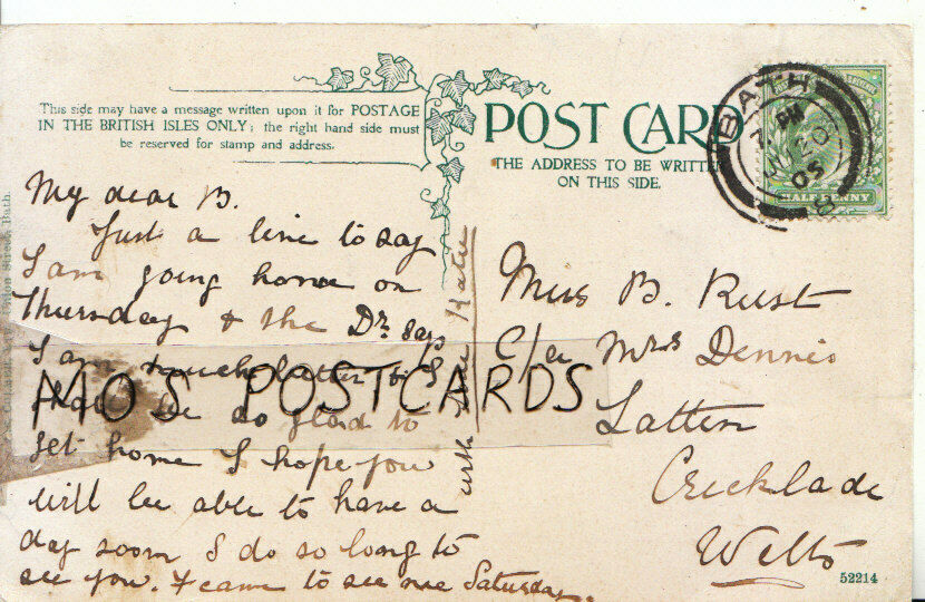 Mo's Genealogy Postcards Recipients Name: Miss B RustRecipients Address: c/o Mrs Dennis - Latton - Cricklade - Wiltshire Sender Details: Genealogy: In an effort to assist people researching their family history I have decided to make postally used pre 1960 postcards available for research purposes. These postcards will have defects which range from minor creases and tears to major faults. The postcards are only being offered for research purposes. Please do not expect a damage free postcard. I will endeavour to list the recipients correct details. Errors may be made. To improve your chances of locating an ancestor why not type the name or address into the search box of my store. Imagine obtaining a postcard written or received by an ancestor. These unique historical records are priceless.