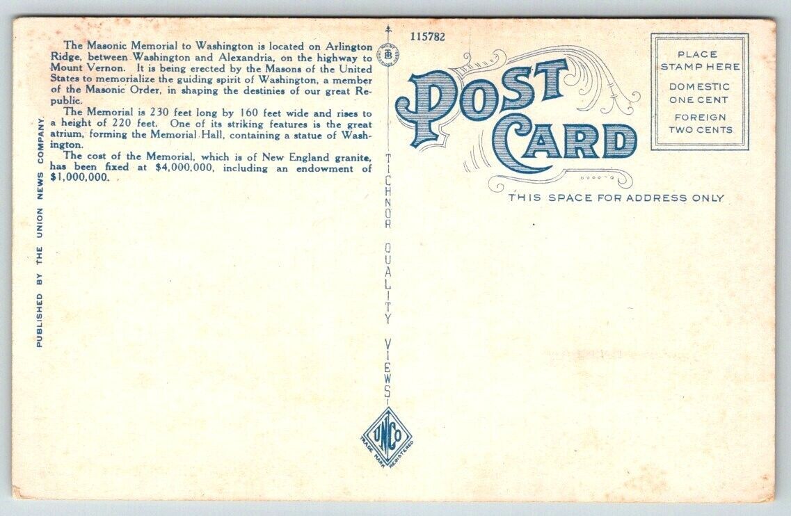 George Washington Masonic Memorial Alexandria Virginia Postcard c1925