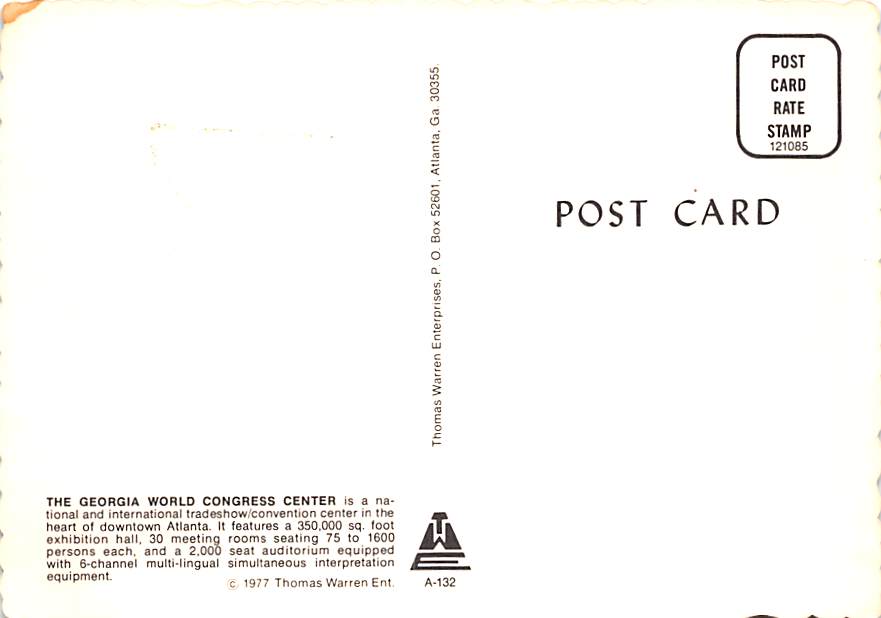 Georgia World Congress Center - Grade: 1 Category: Continental Size Postcard, Approx 4 in x 6 in (10 cm x 15.25 cm) Product Size: Continental size: 4X6 inches (10.5 cm x 15 cm) Grading Scale: Grade 1 = Perfect ... Read More