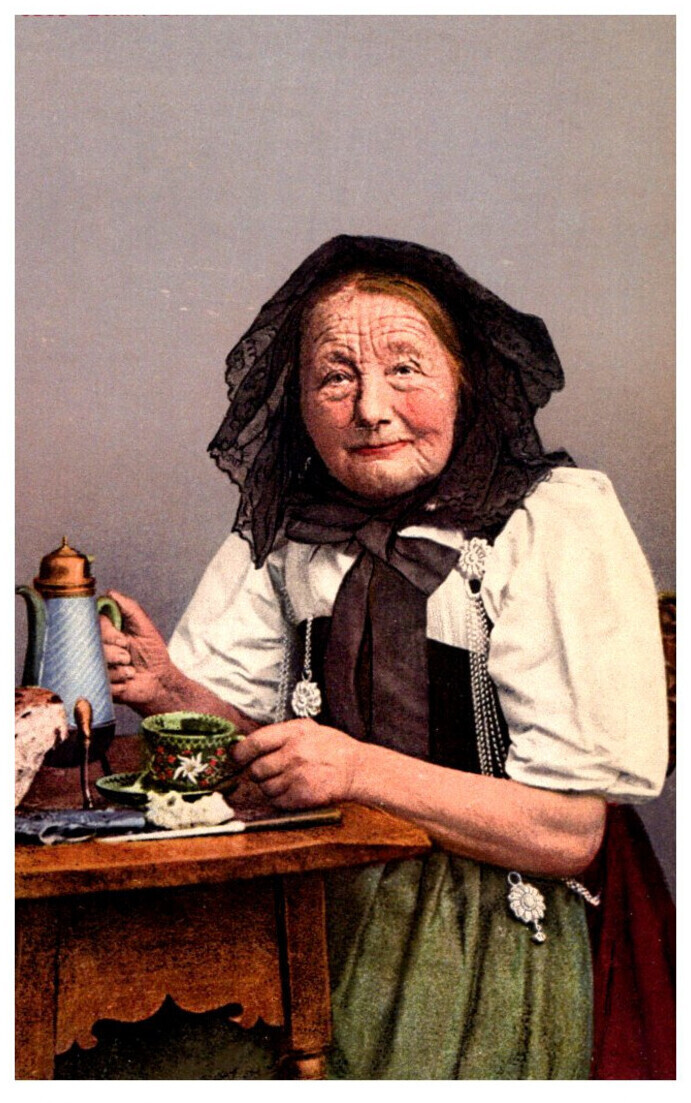 German Elderly Woman drinking Tea, Native Costume