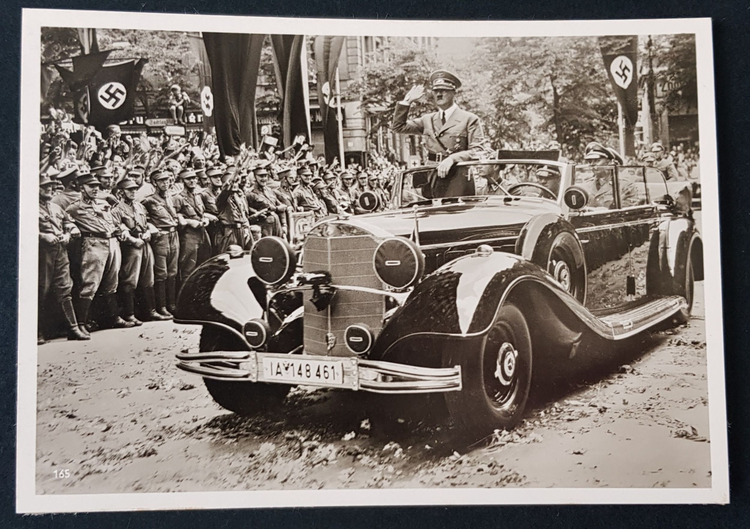 Photograph showing Adolf Hitler in Berlin during his return from France on 6th July 1940 following victory in the West. Hitler is shown travelling in a Mercedes-Benz 770k 'Grosser Mercedes' with the SA Stormtroopers holding back the crowd. With signs of mounting on the rear, otherwise in excellent condition, as shown in the scans. A similar photograph sold at auction in 2021 for $275All small-sized envelope postage prices are:-