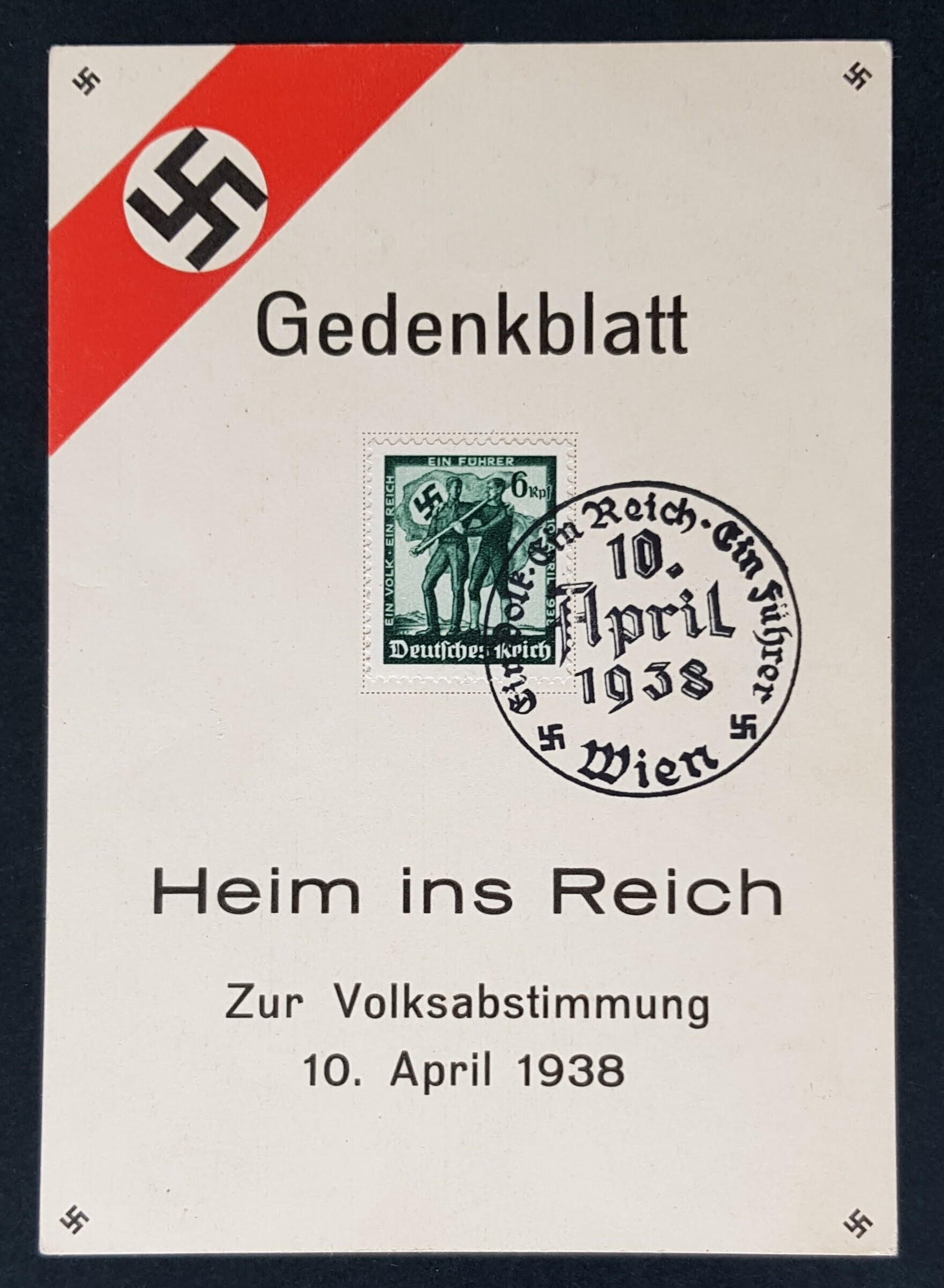 Unused and cancelled to order, official postal card to commemorate the vote for Austria to join Germany, with the official stamp and cancellation 10th April 1938. Back in excellent condition, as shown in the scans.All small-sized envelope postage prices are:-