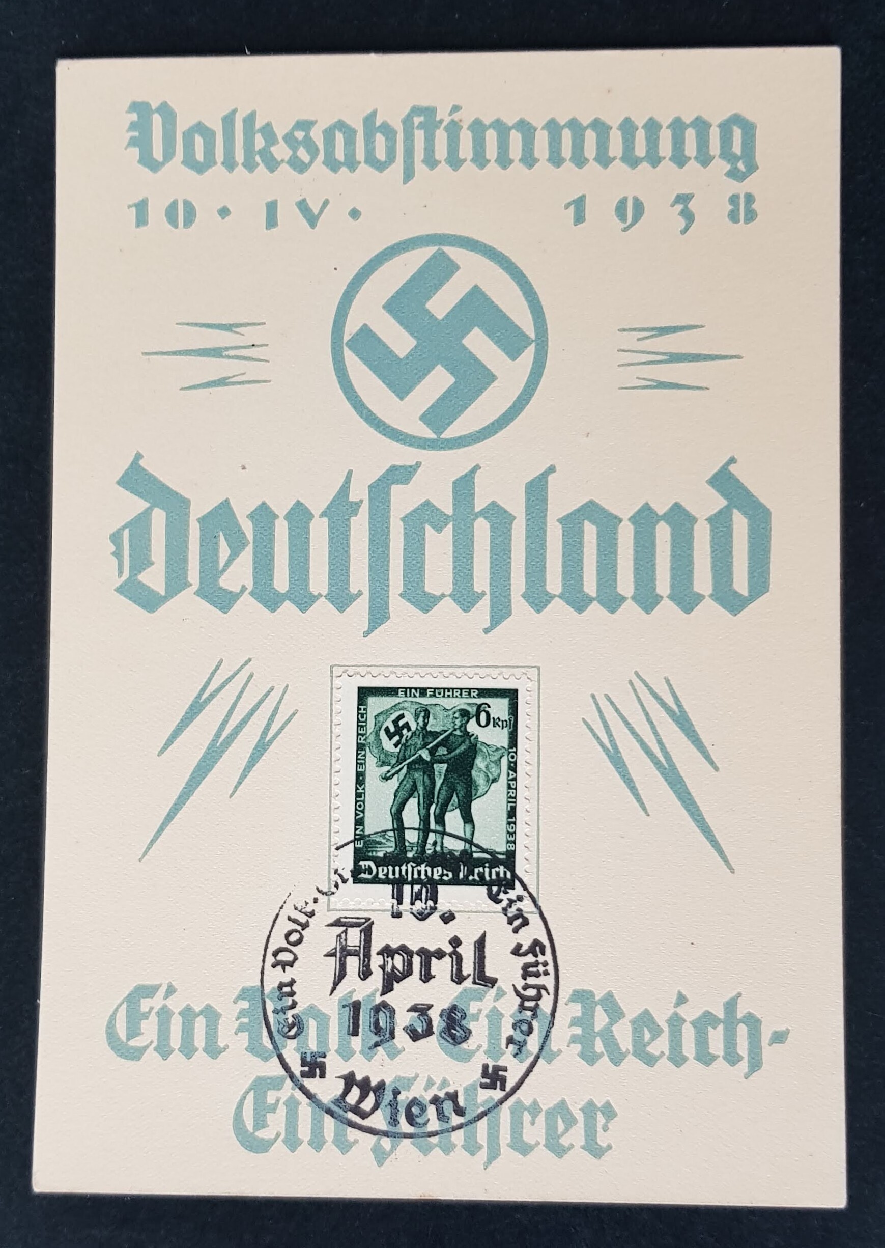 Unused and cancelled to order, official postal card to commemorate the vote for Austria to join Germany, with the official stamp and cancellation 10th April 1938. Back in excellent condition, as shown in the scans.All small-sized envelope postage prices are:-