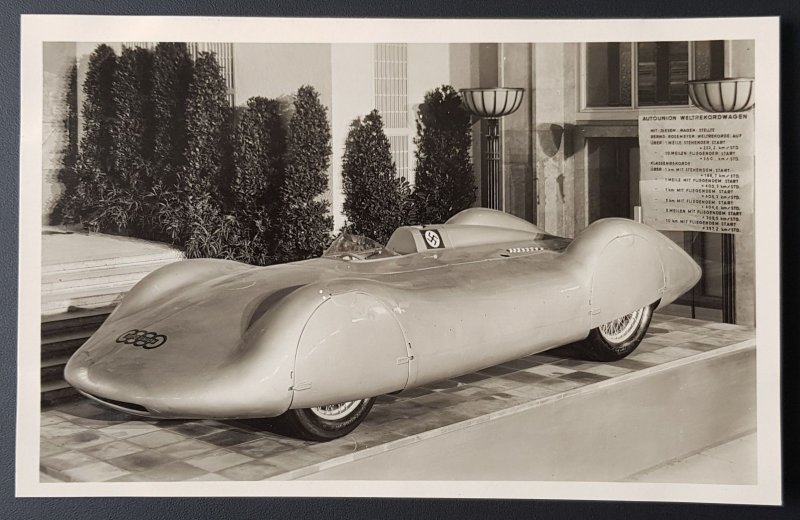 A rare PC showing the streamlined Auto Union 'AUDI' racing car at the 1936 Berlin Auto Show, unused and in excellent condition, as per the scansCombined postage is available; please request an invoice before making payment.