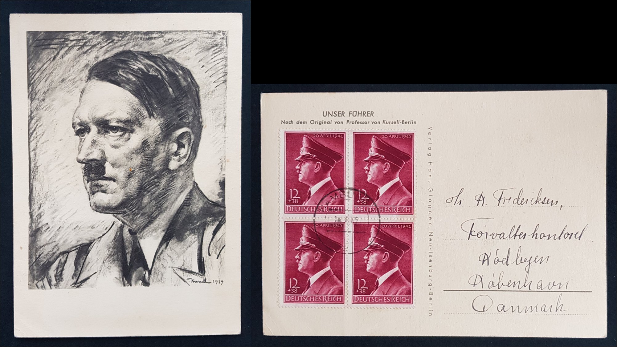 Black & White artists' drawings by Prof. von Kursell from Berlin, Adolf Hitler: Unser Führer. Postally used and carried with a nice block of Hitler stamps commemorating his 53rd birthday, and in excellent condition, as shown in the scans.All small-sized envelope postage prices are:-