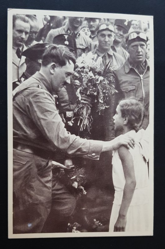 B/w postcard of adolf hitler receiving a gift of flowers from a young girl - reprintSeller Information
