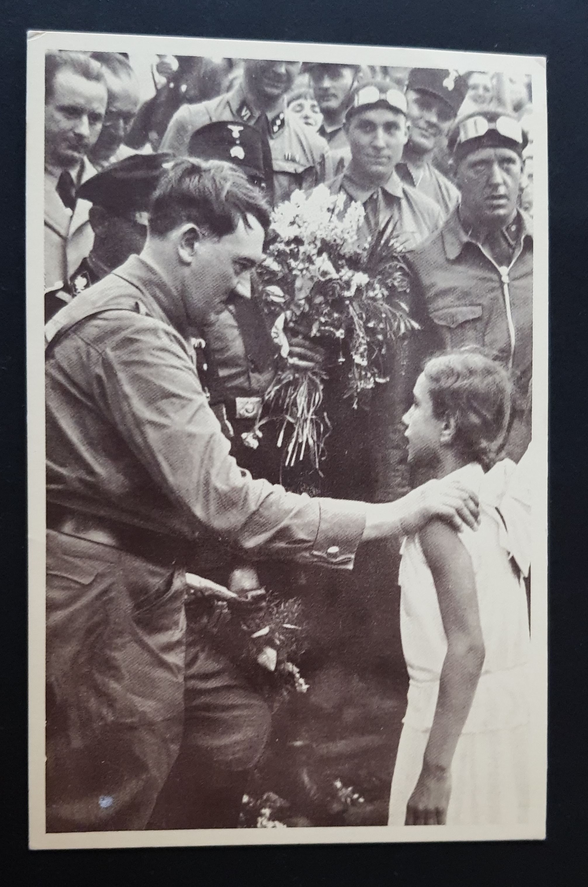 B/w postcard of adolf hitler receiving a gift of flowers from a young girl - reprint