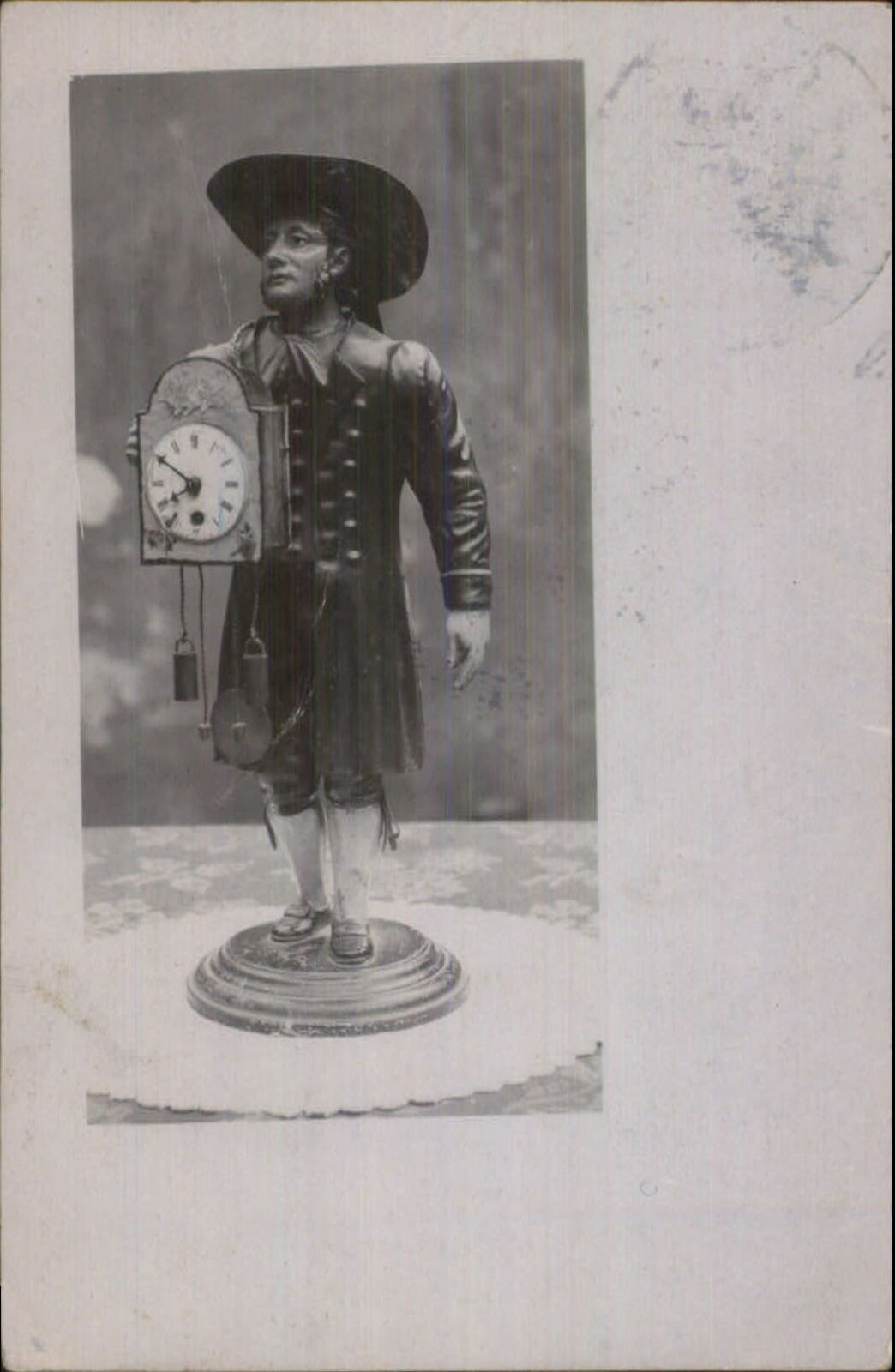 German or Austrian Decorative Statue of Man Clock & Chimes Real Photo Postcard