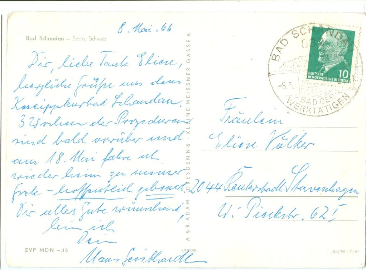 10158 Germany, Bad Schandau, Sachs Schweiz, 1966 used Postcard 14.5x10.5 cm Condition: good overall, corners worn & creased.