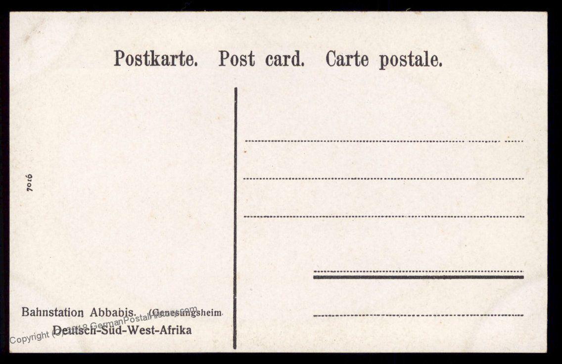Franking: Unused Our Item#: 88676 Deutsch Suedwest-Afrika (DSWA) / German SW Africa card showing the Ababbis train station just after the turn of the (19th) century. A bit worn, a little corner toning from anc ... Read More
