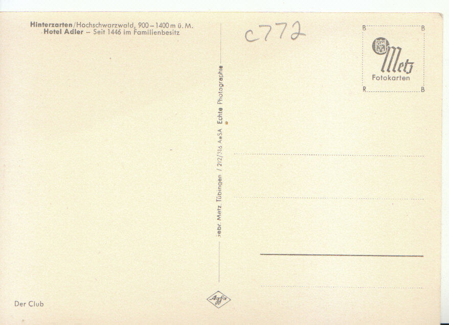 Mo's Postcards Postcard Description: Germany Postcard - Hinterzarten - Hotel Adler - Der Club Genealogy Information: Defects: Postage & Payment: For U.K residents the quoted P & P fee is for any number of postcards purchased at one time. Happy to quote for non UK residents. For multiple purchases please wait for an invoice Listing and template services provided by inkFrog
