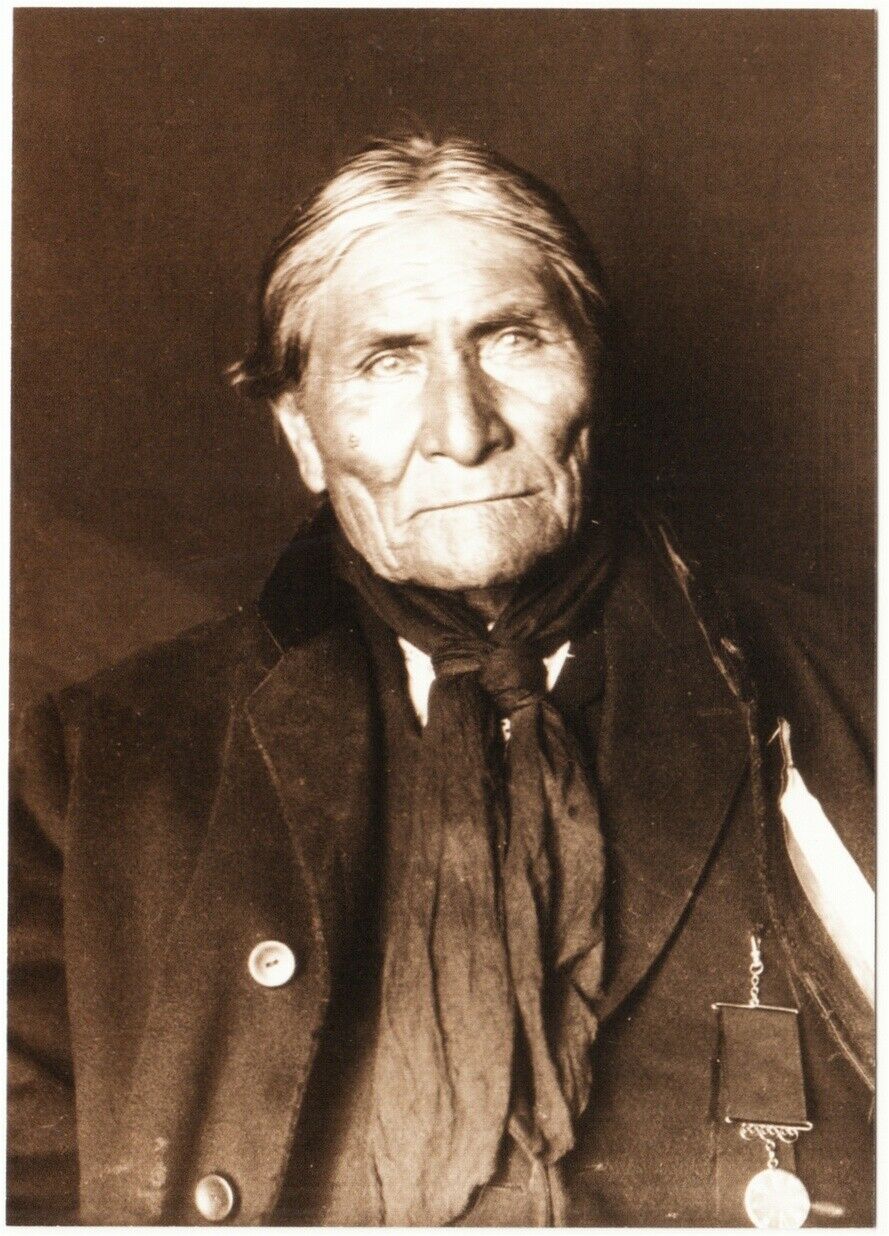 A modern postcard of Chiricahua Apache chief Geronimo (Goyathlay or Goyaalé, 1829-1909) in March 1905. It is from a photograph by De Lancey Gill. This postcard was published in the 2000s. It is about 4 x 6 inches ( ... Read More