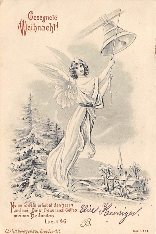Gesegnete Weihnacht Angels Postcard 1903, Grade: 2, , Size: Regular size: Approx 3 1/2 X 5 1/2 inch (9 cm X 14 cm) Grading Scale: Grade 1 = Perfect corners Grade 2 = Very Minimal corner wear, no creases Grade ... Read More
