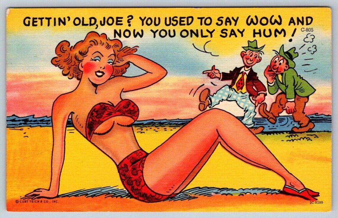 Getting Old Joe? Risque Pinup Bikini Girl, 1952 Comic Linen Curt Teich Postcard