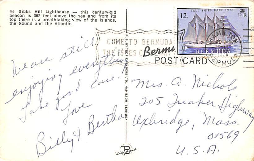 Gibbs Hill Lighthouse Bermuda Postcard Postal Date: {{Product Field 4 ( Postal Used, Unused)}} Grade: 1 Size: Regular Size Postcard - approximately 3 1/2 inch x 5 1/2 inch (9 CM x 14 CM) Grading Scale: Grade ... Read More