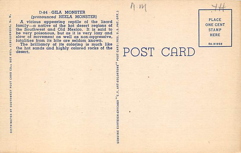 Gila Monster Misc, New Mexico NM Postcards Grade: 1 Size: Regular Size Postcard - approximately 3 1/2 inch x 5 1/2 inch (9 CM x 14 CM) Grading Scale: Grade 1 = Perfect corners Grade 2 = Very Minimal corner wear ... Read More