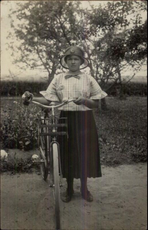 Girl & Her Bicycle c1910 Real Photo Postcard