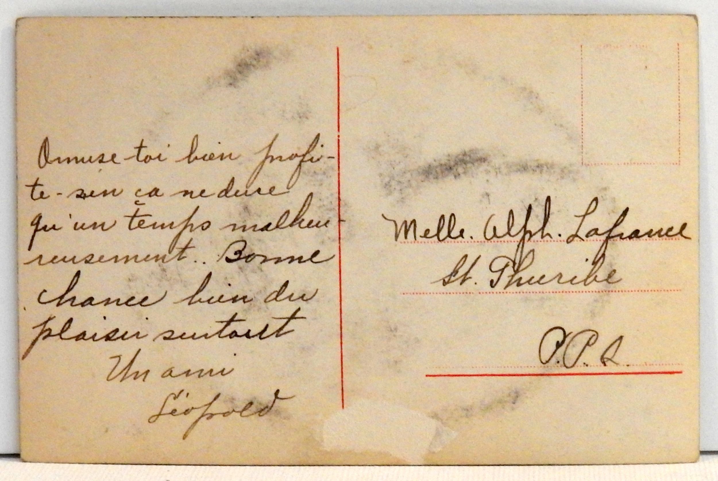 Antique Lithograph Postcard; Girl in pink with pink flowers; handwriting in French on the address side but doesn't appear to have been posted, no stamp; St. Thuribe, Quebec, Canada.